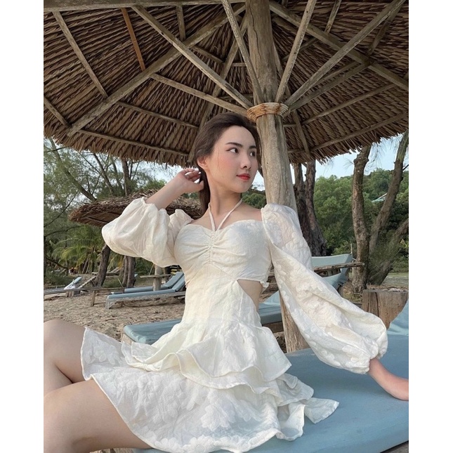 Đầm tầng hoa nổi cổ yếm cut out eo tiểu thư xinh xắn free ship